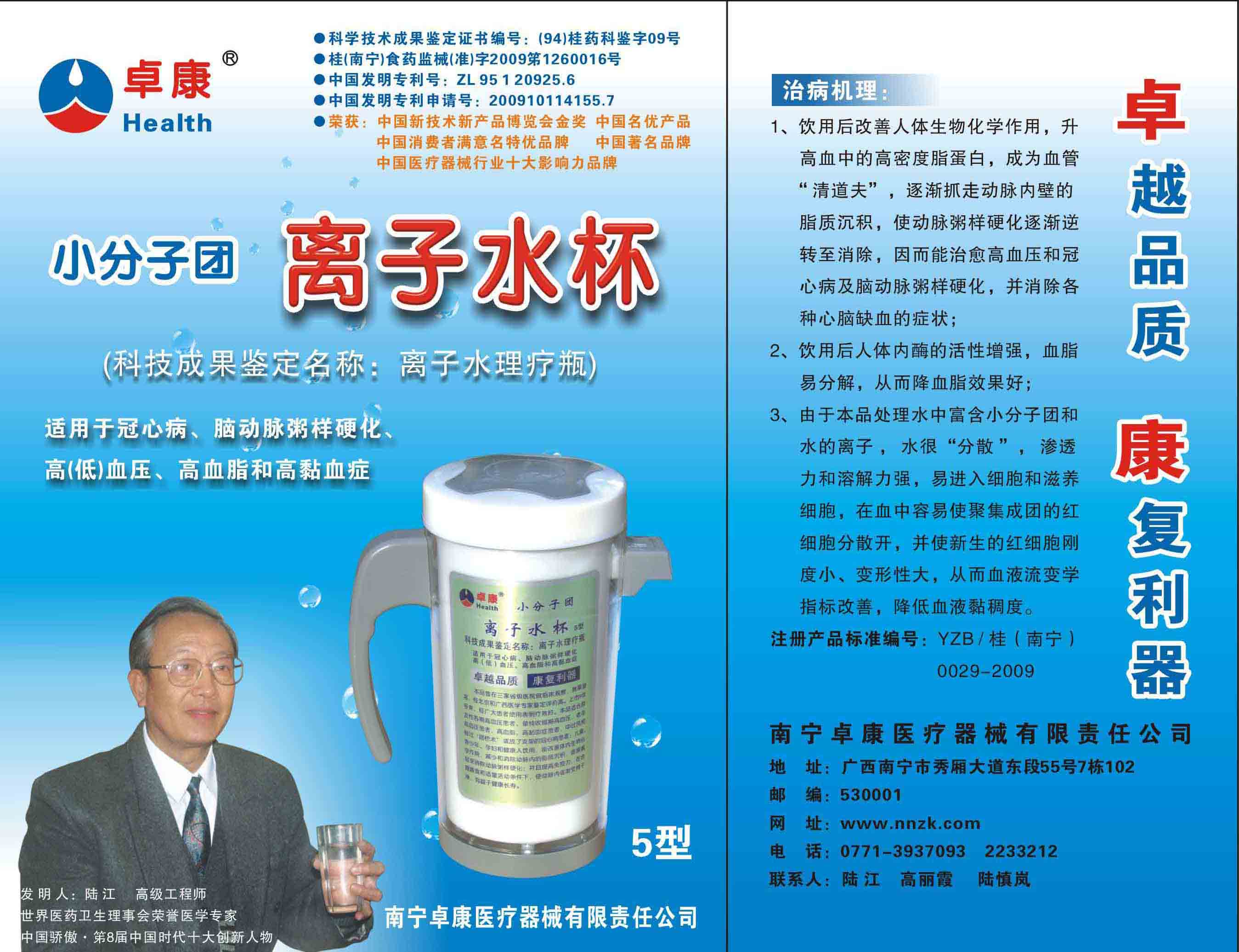 -----我是從事建筑的高工,本來沒有資格去攻克醫(yī)學(xué)難題,卻為了自身健康才扣響醫(yī)學(xué)的大門。由于我1990年患高血壓,因怕中風(fēng)才研究發(fā)明了離子水瓶,我把水處理成微小分子團(tuán)水,飲用后治愈了高血壓。便于1993年底送到三家省級醫(yī)院做臨床試用4個月。經(jīng)北京和廣西醫(yī)學(xué)專家鑒定:"降脂降壓效果好"," 能擴(kuò)大心腦動脈流量,改善心腦電圖以及微循環(huán)","對治療心腦動脈粥樣硬化、高血壓、高血脂有良好的醫(yī)療保健作用。""產(chǎn)品的技術(shù)性能和療效達(dá)到了同類產(chǎn)品的國內(nèi)領(lǐng)先水平,經(jīng)廣西醫(yī)學(xué)科學(xué)情報研究所檢索,未見國外有類似報道。"中國醫(yī)學(xué)科學(xué)院張正國教授從美國國立醫(yī)學(xué)圖書館數(shù)據(jù)庫存Medline檢索英俄文資料,均未見類似報告。2000年上市后,我為了對消費(fèi)者負(fù)責(zé)而繼續(xù)觀察研究,一直通過《信譽(yù)卡》和《質(zhì)量跟蹤調(diào)查書》向患者承諾療效,請用戶使用6個月后反饋效果。和脂壓患者飲用2至5個月內(nèi),消除癥狀,停服藥物,血壓正常;冠心病患者飲用3~5個月逐漸減輕至消除心絞痛、房顫等癥狀,不再服藥,飲用1年左右心電圖正常,經(jīng)冠脈造影掃描無明顯狹窄,表明冠心病痊愈。大量患者還反映許多衰弱器官被修復(fù),讓前列腺增生、慢性咽喉炎、慢性氣管炎、支氣管炎、慢性胃炎、腸炎和膽囊炎等不藥而愈;2型糖尿病患者是因為胰島衰弱致病,飲用該水半年至一年,逐漸減藥至停藥,血糖尿糖正常,真正治愈2型糖尿病。中風(fēng)后遺癥患者飲用六七個月,可逐漸減輕至消除肢體和語言障礙,表明飲用該水能讓壽命很長的神經(jīng)元細(xì)胞逐漸修復(fù),奇跡般地恢復(fù)肢體和語言功能。飲用后還使胸腺和脾臟兩個重要的免疫器官被修復(fù)和增強(qiáng),產(chǎn)生免疫細(xì)胞多,提高了免疫力,使人不生病或少生病。自此, 飲用微小分子團(tuán)水創(chuàng)造了攻克冠心病、高(低)血壓和糖尿病三大醫(yī)學(xué)難題的奇跡。人們對此感到不可思議,但實踐是檢驗真理的唯一標(biāo)準(zhǔn)。